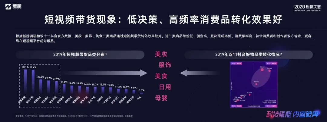 根据新榜调研和双十一抖音官方数据,美妆、服饰、美食三类商品通过短视频带货转化效果较好,其次是日用、母婴。这几类商品单价低、佣金高,且决策成本低、消费频率高,符合消费者和创作者双方诉求,更容易在短视频平台成为爆品。