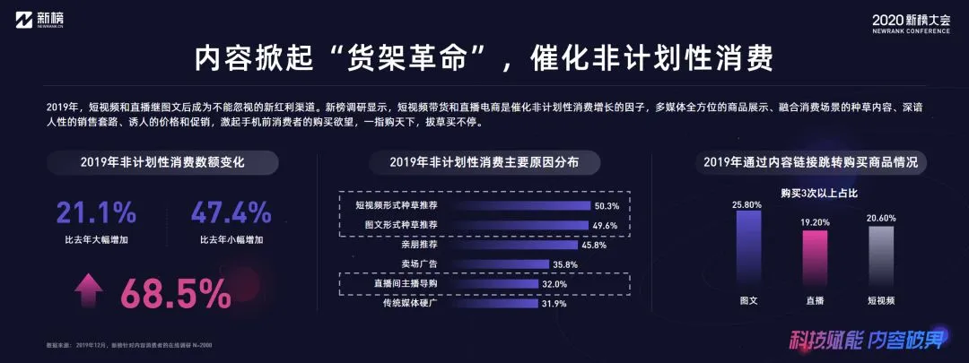2019年,短视频和直播成为不能忽视的新红利渠道。新榜调研显示,68.5%的消费者表示2019年的非计划性消费相比去年有增加,其中21.1%表示增加幅度较大。短视频带货和直播电商是催化非计划性消费增长的因子,多媒体全方位的商品展示、融合消费场景的种草内容、深谙人性的销售套路、诱人的价格和促销,激起手机前消费者的购买欲望,一指购天下,拔草买不停。