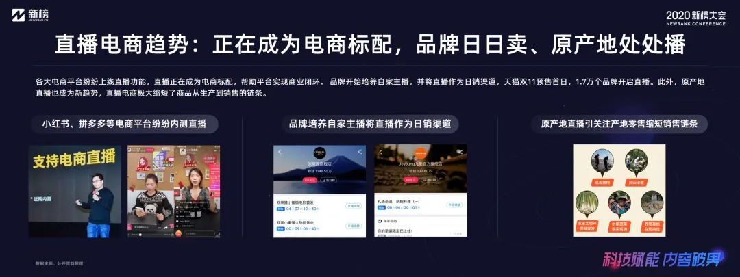 品牌也开始重视重视直播电商,培养自家主播,并将直播作为日销渠道,天猫双11预售首日,1.7万个品牌开启直播。此外,原产地直播也成为新趋势,直播电商极大缩短了商品从生产到销售的链条。