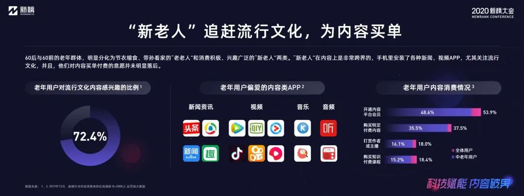 新榜调研发现,老年用户对流行文化内容感兴趣的占比达到了72.4%。他们的手机中安装了各种新闻、视频APP,并且,他们对于内容消费也表现得相当积极,不输于年轻人。