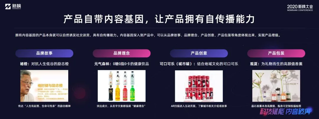 拥有内容基因的产品本身就可以自然诱发社交谈资,具有自传播能力。内容基因深入到产品中,可以从品牌故事、品牌理念、产品创意、产品包装等角度体现出来,实现产品增值。因为有了内容的注入,所以有了对抗人生低谷的励志褚橙、0糖0脂0卡的健康饮品元气森林、结合地域文化的可口可乐城市罐和为礼物而生的高颜值香薰观夏。