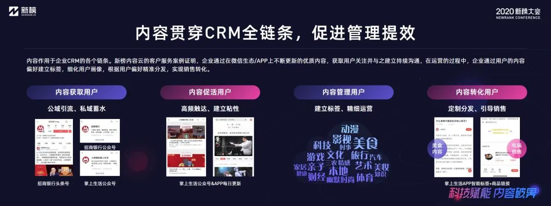 内容作用于企业CRM的各个链条。新榜内容云的客户服务案例证明,企业通过在私域(微信生态/APP)上不断更新优质内容,能够获取用户关注并与之建立持续沟通,在运营的过程中,企业通过用户的内容偏好建立标签,细化用户画像,根据用户偏好精准分发,实现销售转化。