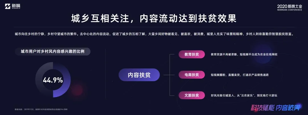这种内容的破界交流达到了“内容扶贫”的效果:村镇用户通过内容平台也可以学习大量的农业以及相关生产生活技能知识(教育扶贫);他们也通过短视频与直播圈粉、卖货,打通农产品销售通路(电商扶贫);村镇的优美自然风光能够得到发现与欣赏,吸引城里人从在内容平台“云农家乐”到亲身前往实地打卡游玩(文旅扶贫)。