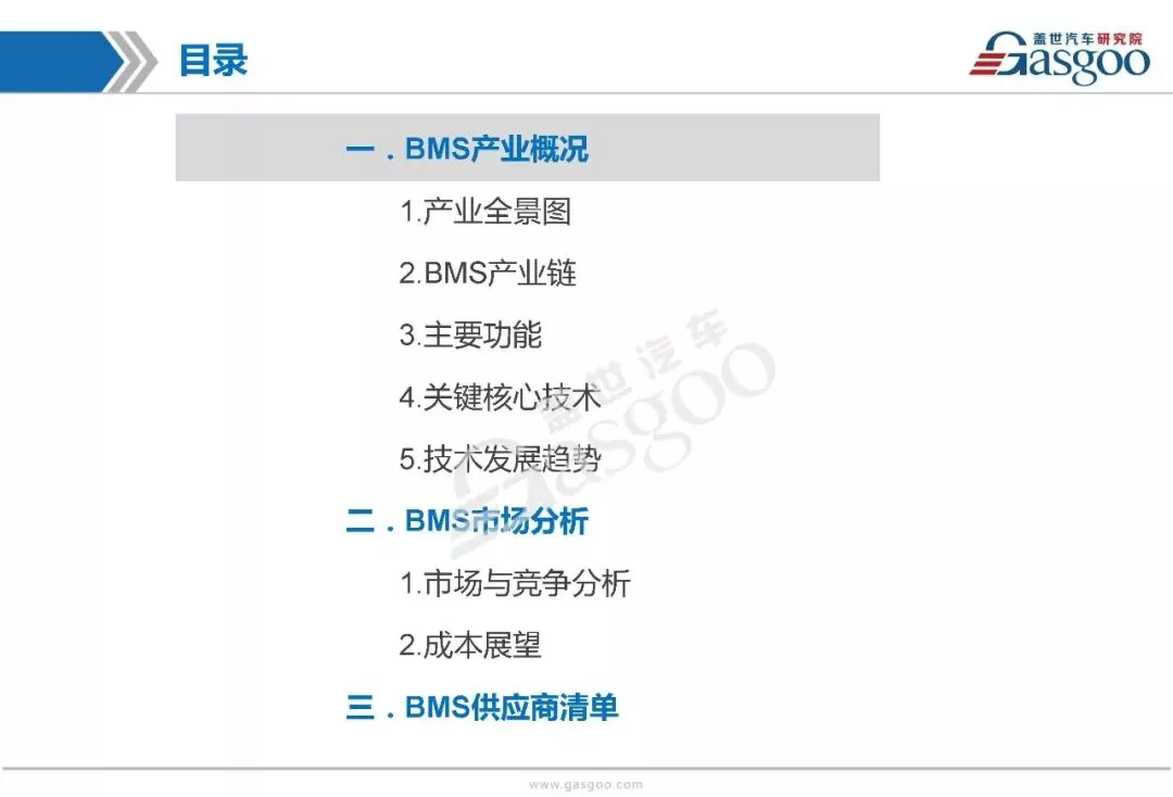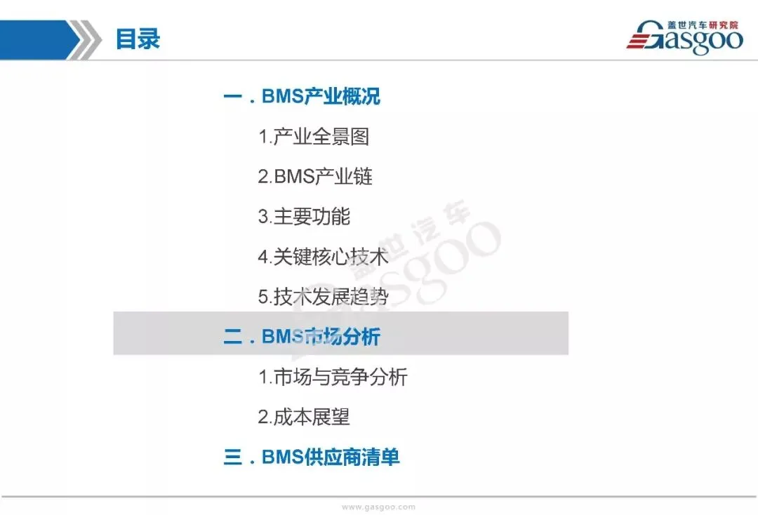 盖世汽车近日针对BMS进行了产业研究,内容包括:产业全景图、主要功能、关键核心技术、技术发展趋势、市场与竞争分析、成本展望、供应商清单等,并生成了一份产业报告,供行业参考!