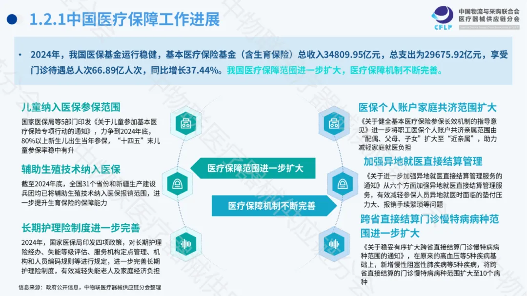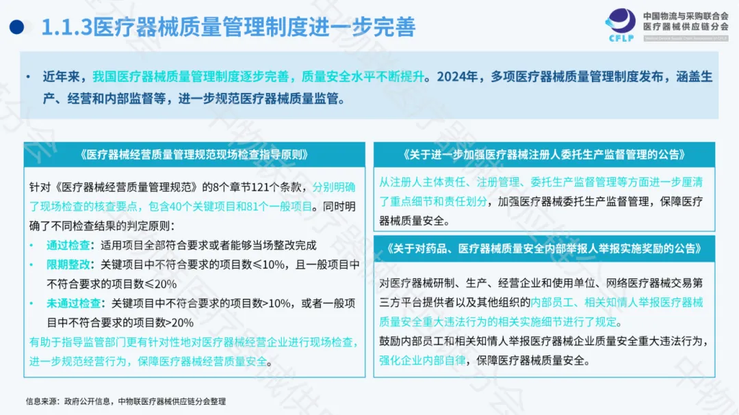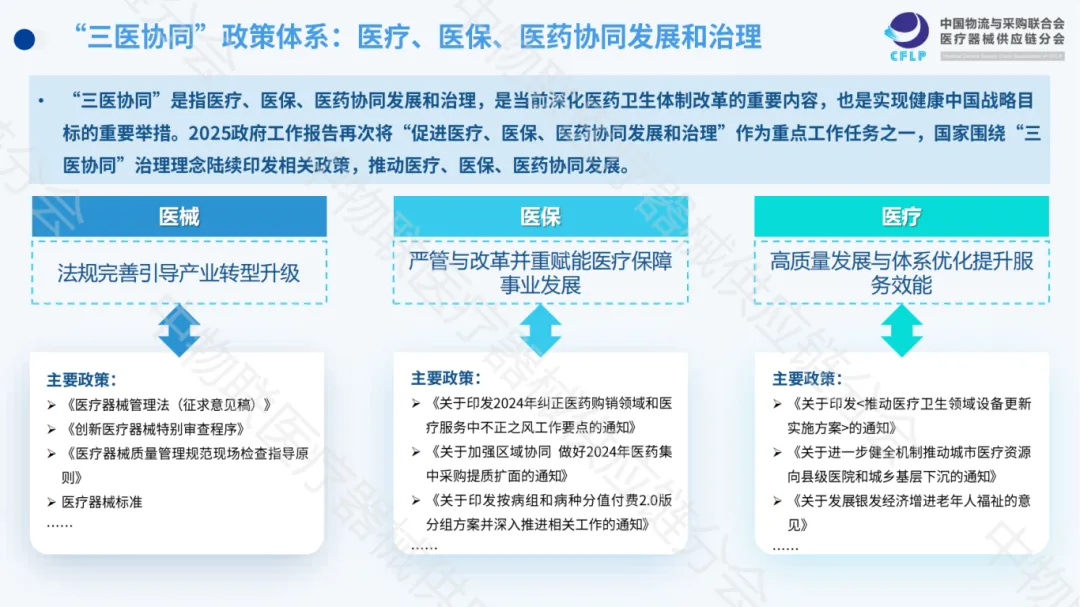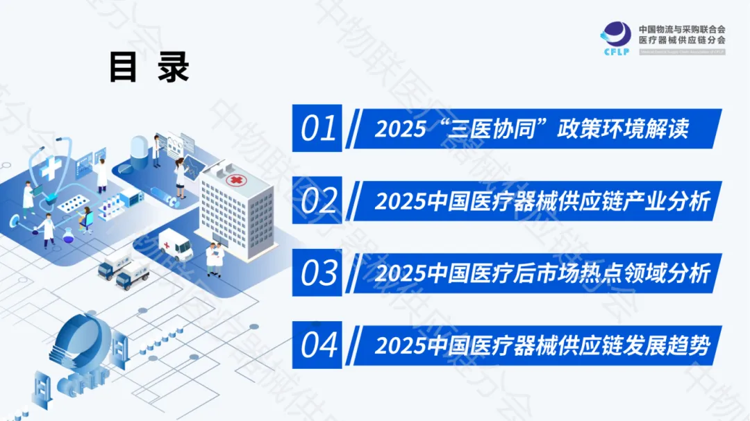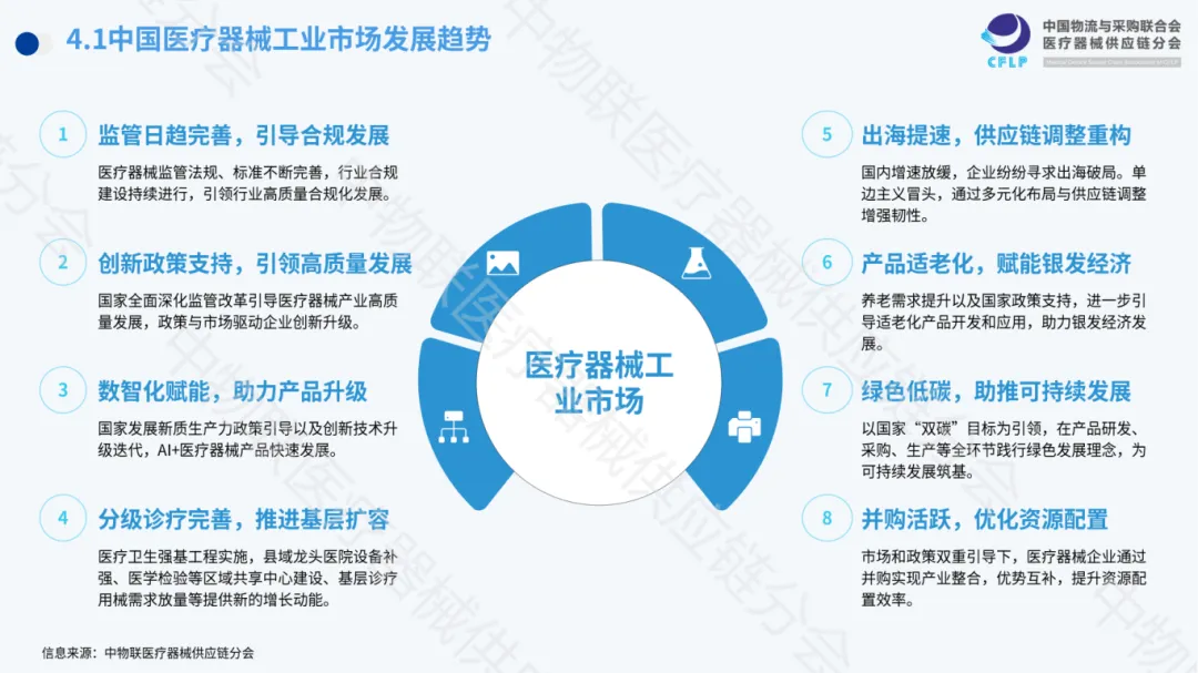 本报告通过对医疗器械供应链宏观政策环境进行解读分析,并对医疗器械供应链各环节、各细分领域开展了多方面、多维度的深度研究,对发展现状及面临的挑战进行了真实、客观的总结与分析,并对2025年行业发展作出了预判和展望,以期为医疗器械行业提供决策参考和经验借鉴。以下为本报告重点内容解读