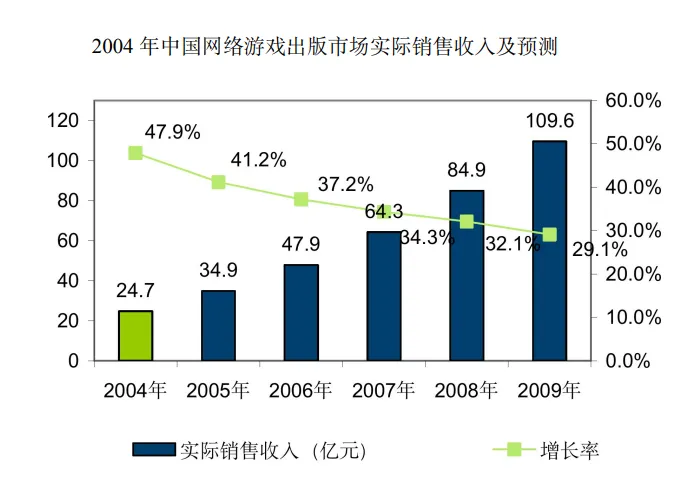 《2006年度中国游戏产业报告》提到,2006年中国网络游戏市场规模达到了65.4亿元,比2005年增长73.5%,在大型角色扮演类网游、休闲游戏市场方面,前者实际销售收入53.1亿元,后者实际市场销售额12.3亿元。