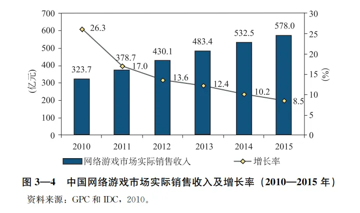 《2010年度中国游戏产业报告》提到,2010年中国网络游戏市场规模达到了323.7亿元,比2009年增长26.3%,其中自主研发网游市场实际销售收入193亿元。2008年大型角色扮演类网游市场实际销售收入203.3亿元,休闲游戏市场实际销售78.5亿元,网页游戏市场实际销售收入41.9亿元。