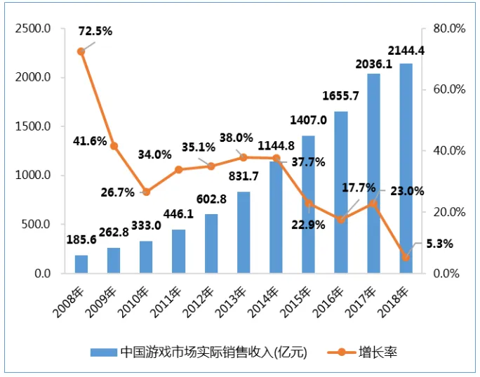 《2018年度中国游戏产业报告》提到,2018年中国网络游戏市场规模达到了2144.4亿元,同比增长5.3%,其中客户端网游619.6亿元、网页游戏126.5亿元、移动游戏市场销售收入1339.6亿元,主机游戏市场实际销售收入10.5亿元。