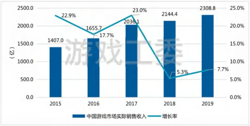 《2019年度中国游戏产业报告》提到,2019年中国网络游戏市场规模达到了2308.8亿元,同比增长7.7%,其中客户端网游615.1亿元、网页游戏98.7亿元、移动游戏市场销售收入1581.1亿元。