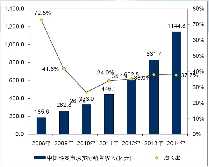 《2014年度中国游戏产业报告》提到,2014年中国网络游戏市场规模达到了1144.8亿元,同比增长37.7%,其中客户端网游608.9亿元、网页游戏202.7亿元、社交游戏57.8亿元,移动游戏市场销售收入274.9亿元,单机市场销售收入0.5亿元。