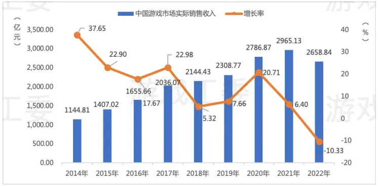 《2022年度中国游戏产业报告》提到,受疫情影响,2022年中国网络游戏市场实际销售收入2658.84亿元,同比下降10.33%,其中客户端网游613.73亿元,网页游戏52.80亿元,休闲移动游戏收入为344.38亿元,另外移动游戏市场销售收入1930.58亿元,同比下降14.40%,这是自2014年以来中国移动游戏市场出现首次下降。