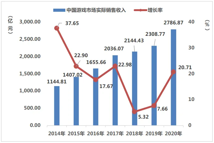 《2020年度中国游戏产业报告》提到,2020年中国网络游戏市场规模达到了2786.87亿元,同比增长20.71%,其中客户端网游559.2亿元、网页游戏76.08亿元、移动游戏市场销售收入2096.76亿元。