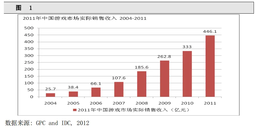《2011年度中国游戏产业报告》提到,2011年中国网络游戏市场规模达到了446.1亿元,比2010年增长34%,PC网络游戏市场实际销售收入428.5亿元。2011年大型角色扮演类网游市场实际销售收入250.8亿元,休闲游戏市场实际销售116.1亿元,网页游戏市场实际销售收入55.4亿元。