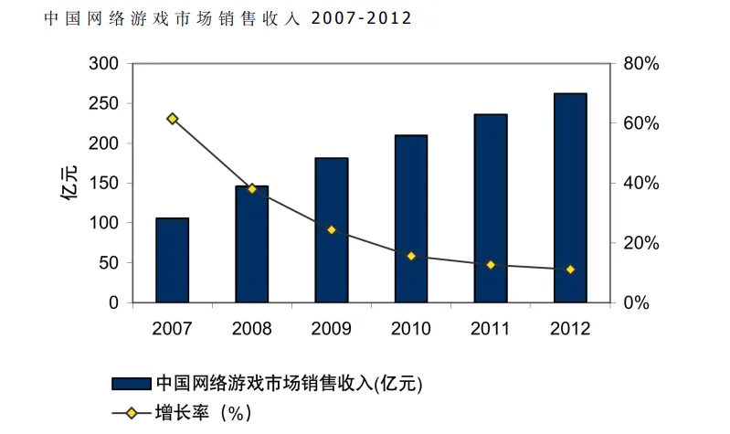 《2012年度中国游戏产业报告》提到,2012年中国网络游戏市场规模达到了602.8亿元,同比增长35.1%,其中网络游戏市场实际销售收入569.6亿元(客户端网游451.2亿元、网页游戏81.1亿元、社交游戏37.3亿元),移动游戏市场销售收入32.4亿元,单机市场销售收入0.75亿元。