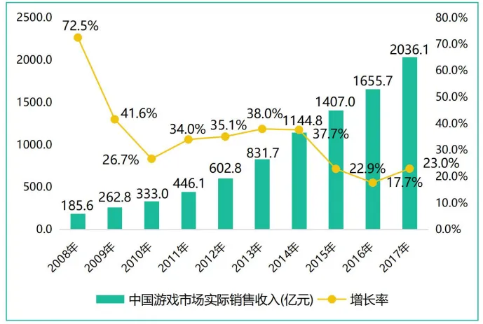 《2017年度中国游戏产业报告》提到,2017年中国网络游戏市场规模达到了2036.1亿元,同比增长23%,其中客户端网游648.6亿元、网页游戏156亿元、移动游戏市场销售收入1161.2亿元,主机游戏市场实际销售收入13.7亿元。