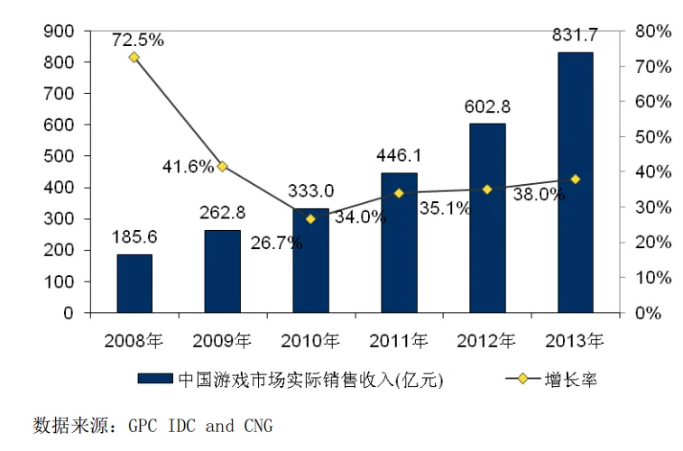 《2013年度中国游戏产业报告》提到,2013年中国网络游戏市场规模达到了831.7亿元,同比增长38%,其中客户端网游536.6亿元、网页游戏127.7亿元、社交游戏54.1亿元,移动游戏市场销售收入112.4亿元,单机市场销售收入0.89亿元。