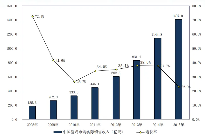 《2015年度中国游戏产业报告》提到,2015年中国网络游戏市场规模达到了1407亿元,同比增长22.9%,其中客户端网游611.6亿元、网页游戏219.6亿元、社交游戏57.8亿元,移动游戏市场销售收入514.6亿元,单机市场销售收入1.4亿元,电视游戏收入2.2亿元。