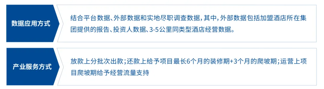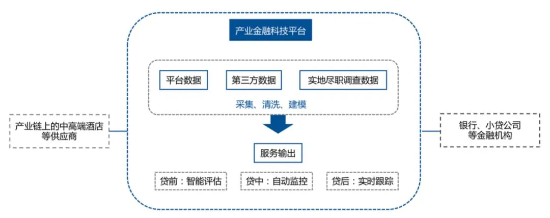 目前,在该模式下,线上旅游平台主要以酒店住宿业为切入点,解决中高端酒店的新建装修、升级改造的融资需求,同时,也正不断将业务扩展到其他领域。以酒店住宿业为例,在平台数据和第三方数据的基础上,线上旅游平台进一步加入了实地尽职调查数据,其中实地尽职调查数据主要包括酒店投资人数据、酒店位置及周边酒店经营数据等,即使该酒店不在自身的供应链体系内,也可利用实际尽职调查数据预判酒店未来经营状况。