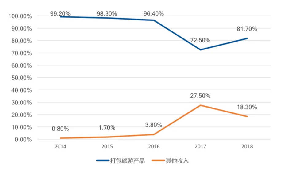 2016年之前,途牛的主要收入来自于打包旅游产品,2017年开始其他业务收入开始快速上涨。2018年,途牛其他收入较2017年下降32.1%,年报表示主要是由于金融服务收入和保险服务收入的下降。可见,金融服务已经在途牛的业务结构中扮演着重要角色。