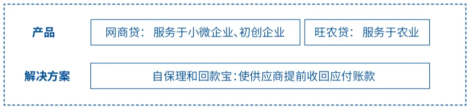 目前网商银行针对各产业内的中小微企业提供了一系列的资金融通产品和解决方案,例如为小微企业和初创企业推出的“网商贷”,为农业产业设计推出的“旺农贷”以及为企业供应链上资金融通推出的两大解决方案“自保理”和“回款宝”等。