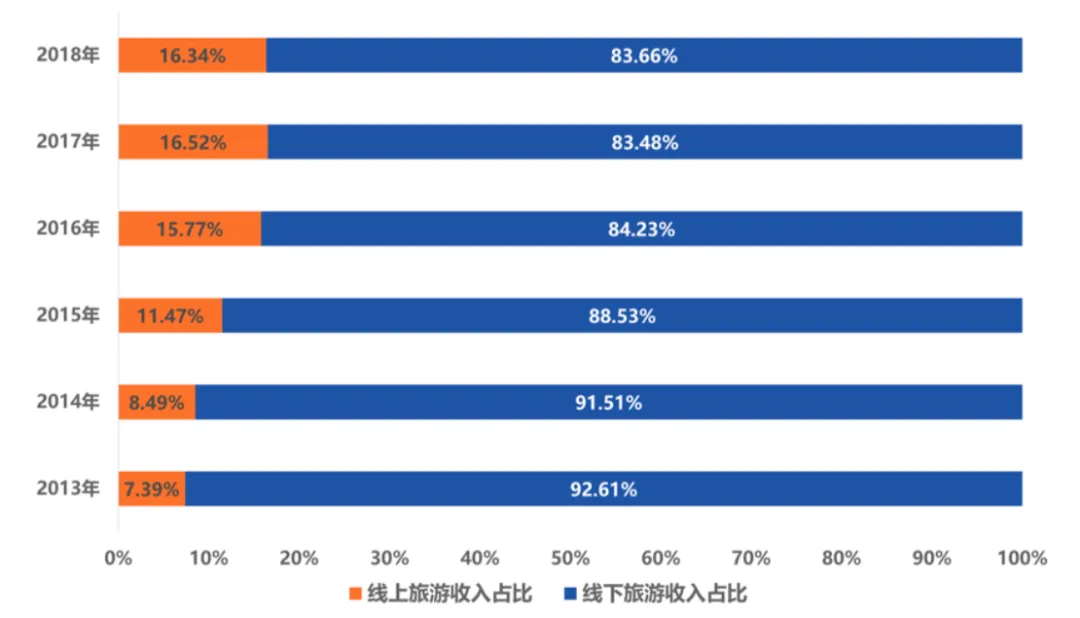 伴随互联网技术的日臻成熟,在消费需求和政策的拉动下,越来越多的旅游消费者开始选择在线预订旅游产品,线上旅游市场快速发展,线上旅游平台的优势地位愈加凸显。根据华经产业研究院数据,2013年到2018年的6年间,中国线上旅游市场的收入规模逐年增加,到2018年底已达9754亿元。以收入规模衡量,线下旅游仍然是当前旅游收入的主要来源。