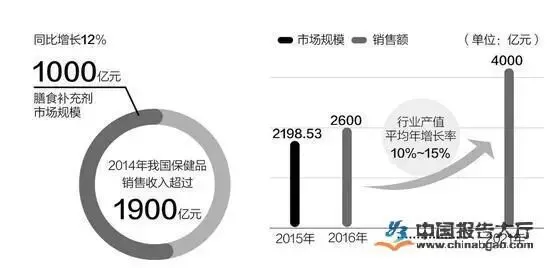2010年,我国保健品市场产值仅为581.75亿元,销售收入为558.02亿元,国内市场规模为557.29亿元,到2014年时,我国保健品市场产值增长至2083.25亿元,销售收入飙升至1903.51亿元,市场规模扩大到1935.61亿元。保健品行业产值平均年增长率为10%-15%,销售收入和市场规模增长同样迅速。