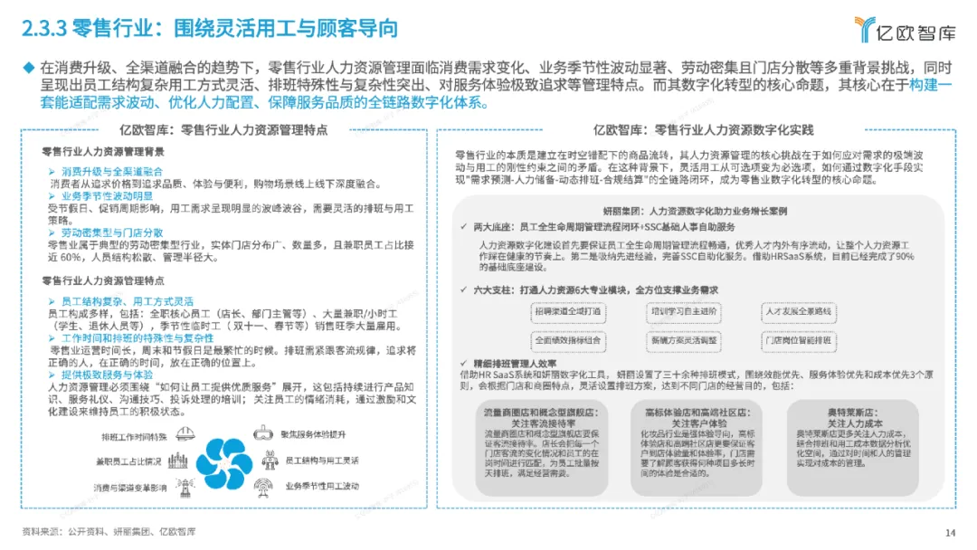 差异源于行业自身的用工结构与业务特性,转型方向各有侧重。金融行业受强监管约束,又是知识密集型领域,核心聚焦风险管控与高端人才全生命周期管理,靠数据中台实现合规预警与精准识人。制造业蓝领占比高,数字化操作基础较弱,转型重点放在蓝领适配与技能重塑上,主推移动端优先、易用性强的平台,搭配直播带岗解决招工难题。零售行业业务波动大、兼职员工多,灵活用工与智能排班是核心需求,构建“需求预测-动态排班-合规结算”的全链路闭环。互联网行业组织扁平、迭代速度快,更看重敏捷管理与人才密度,推行OKR绩效管理与长期激励,贴合新质生产力发展的人才需求。