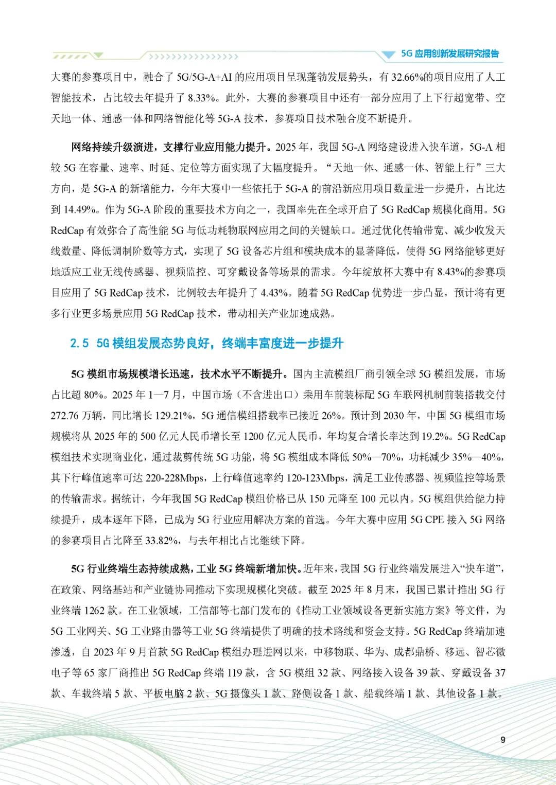 报告提出,随着《5G规模化应用“扬帆”行动升级方案》的深入实施,政策与市场双轮驱动效应显著增强。一方面,各级政府出台了一系列支持5G应用发展的政策措施,为5G技术的研发和应用提供了有力保障;另一方面,市场需求的持续增长也为5G应用的规模化推广提供了强大动力。预计到2025年底,5G应用将在更多领域实现常态化运行,催生出更多具备规模化推广价值的创新场景。