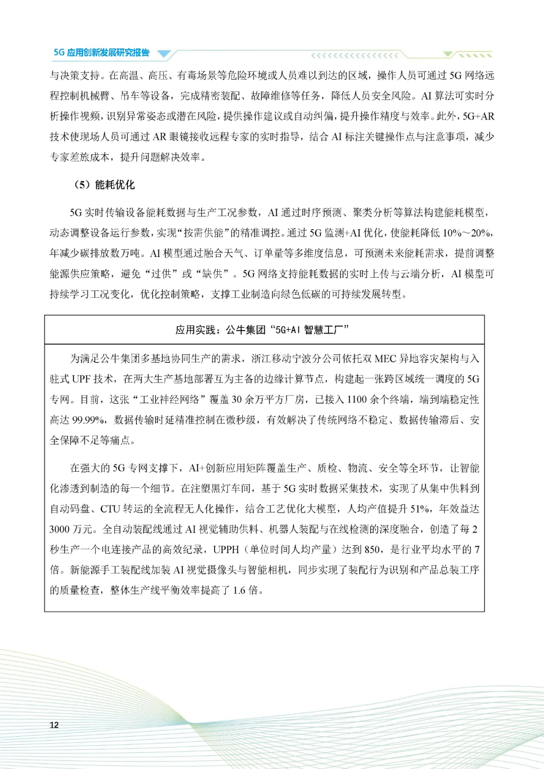报告强调,5G与AI的深度融合正成为推动行业智能化升级的关键力量。在第八届“绽放杯”5G应用征集大赛中,超过32%的参赛项目应用了人工智能技术,占比显著提升。例如,在工业制造领域,5G+AI技术通过实时监控生产流程、精准预测设备故障、优化供应链管理等方式,大幅提升了生产效率和产品质量。格力“黑灯工厂”便是典型案例,其利用5G-A技术实现全流程设备无缝互联,AI系统对生产流程进行智能优化调控,生产效率显著提升,产品缺陷率大幅下降。