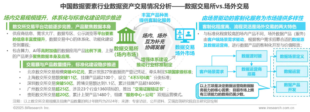 数据资产的产品化封装与市场化流通是数据要素价值释放的重要环节。随着数据经济的蓬勃发展,数据交易所作为由政府设立的官方数据交易平台,其设立数量、产品丰富度、入驻数商数量、平台覆盖维度等多方面表现提升显著,以“京沪广深贵”为代表五大头部交易所在交易规模、标准制定、资产分类、跨境合作等领域充分发挥了行业主导作用,推动国内数据资产场内交易体系的完善与“全国统一大市场+区域特色专区”的建设。虽然近年数据交易所的交易规模有所提升,但受到场内交易流程复杂、交流成本高、数据场内留痕、市场多样化不足等负面因素的影响,目前国内的数据交易呈现“内冷外热”的分布模式,“点对点”的场外交易依旧占据市场主导地位。与场内市场相比,数据资产的场外交易具备更强的灵活性与多样性,能够根据客户端的场景驱动定义、适配恰当的数据服务,推动市场内数据交易的流通与资源的快速对接,于24年初颁布的《“数据要素”x三年行动计划》将征求意见稿中的“场内交易大幅提升”调整为“场内交易与场外交易协调发展”,从政策角度认可了场外交易对于推动数据要素市场发展的重要意义,但如何在缺少透明化、标准化、集中化的市场中保障数据信息安全与合规交易成为新阶段行业发展面临的首要问题。此外,在没有法定中间商的情况下,如何确认数据产品各方的权属关系,合理、合法的分配利润也将成为影响场外交易持续、稳定、合规发展的关键。
