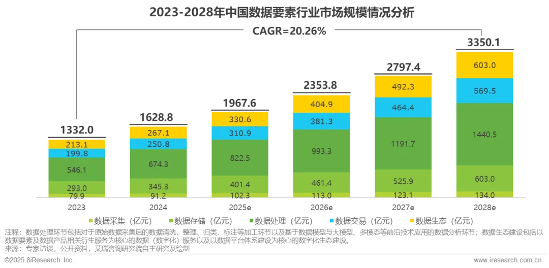 近年国内数据要素产业发展呈现稳步增长态势,中国数字经济规模由2017年的27.2万亿增长至2023年的53.9万亿,六年整体规模翻了一倍,复合增长率约为12.07%。2024年以数字产品制造业、数字技术应用业为代表的数据经济核心产业增加值达到13.49万亿元,约为同年期GDP的10%,成为推动国内经济整体发展的重要驱动力。随着数据产业标准化体系的完善、创新案例与产业试点规模的扩充以及服务前沿技术场景的外延价值提升,国内数据要素行业规模将以约20.26%的复合增长率保持高速增长,预计2025年整体规模将达到2000亿左右,2028年将正式突破3000亿。其中以数据加工与分析为核心的数据处理环节,将成为数据要素产业规模占比最高的细分产业,预计2028年其整体规模即将达到1440亿元。