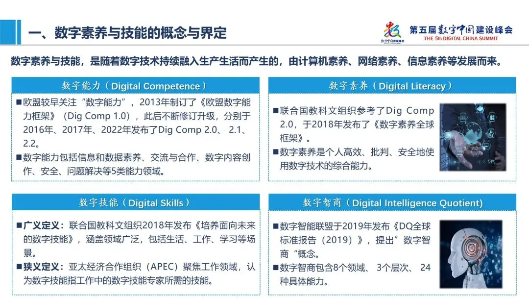 《全民数字素养与技能发展研究报告》(以下简称《报告》)指出,数字素养与技能是随着数字技术持续融入生产生活而产生的,由计算机素养、网络素养、信息素养等发展而来。和数字素养与技能相关的概念包括数字能力、数字素养、数字技能、数字智商等。