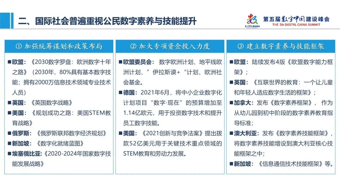 一是全民全生命周期数字素养与技能持续提升。例如,编程教育等信息技术内容已经纳入到小学、初中科学课程和中小学综合实践活动课程,数字经济专业正式获批2021年度新增备案本科专业。