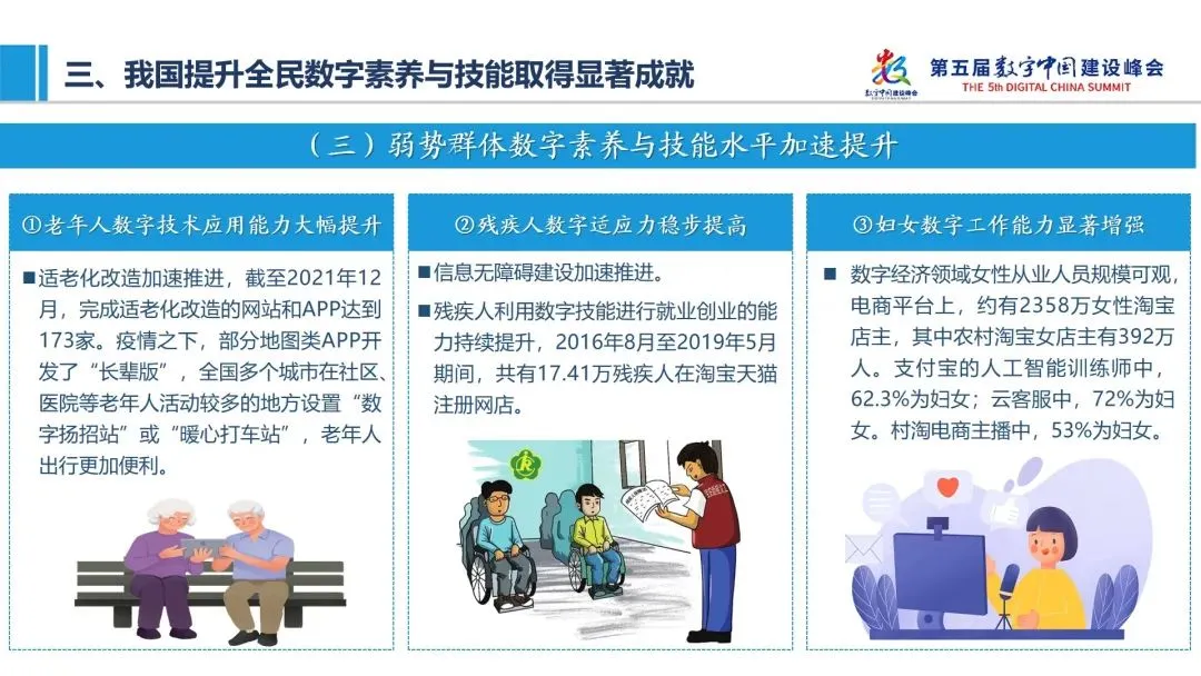 三是弱势群体数字素养与技能水平加速提升。适老化改造成效显著,截至2021年12月,完成适老化改造的网站和APP达到173家。疫情之下,部分地图类APP开发了“长辈版”地图,老年人出行更加便利。数字经济领域女性从业人员规模可观,电商平台上,约有2358万女性淘宝店主,其中农村淘宝女店主有392万人。