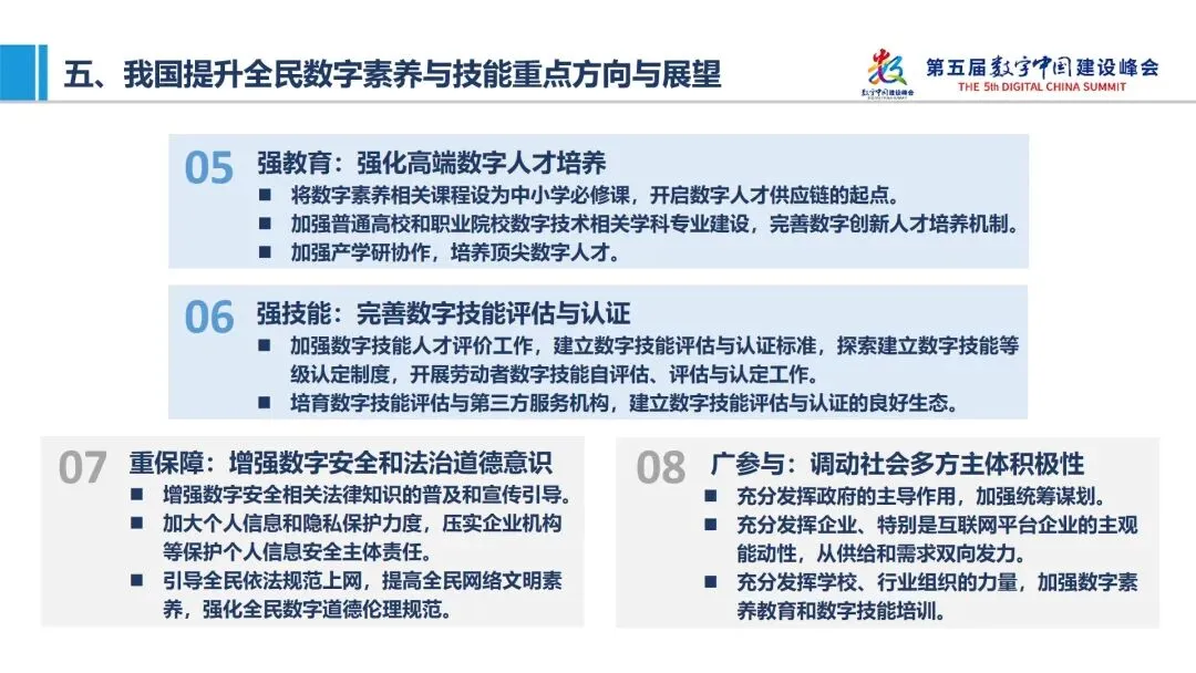 最后,《报告》对我国提升全民数字素养与技能提出8个方面的建议,包括:建立数字素养与技能框架体系,持续丰富优质数字资源供给,突出场景驱动和应用牵引,满足不同群体差异化需求,强化高端数字人才培养,完善数字技能评估与认证,增强数字安全和法治道德意识,调动社会多方主体积极性。