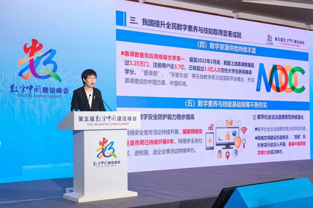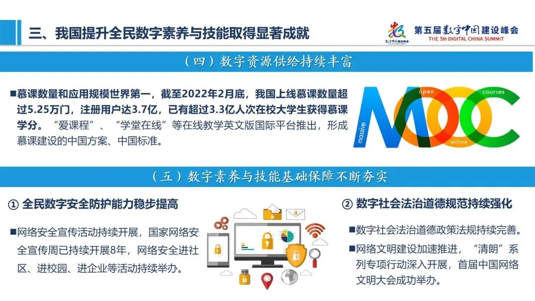 四是数字资源供给持续丰富。我国慕课数量和应用规模世界第一,截至2022年2月底,上线慕课数量超过5.25万门,注册用户达3.7亿,已有超过3.3亿人次在校大学生获得慕课学分。五是数字素养与技能基础保障不断夯实。一方面,全民数字安全防护能力稳步提高,国家网络安全宣传周持续开展8年。另一方面,数字社会法治道德规范持续强化,首届中国网络文明大会成功举办。