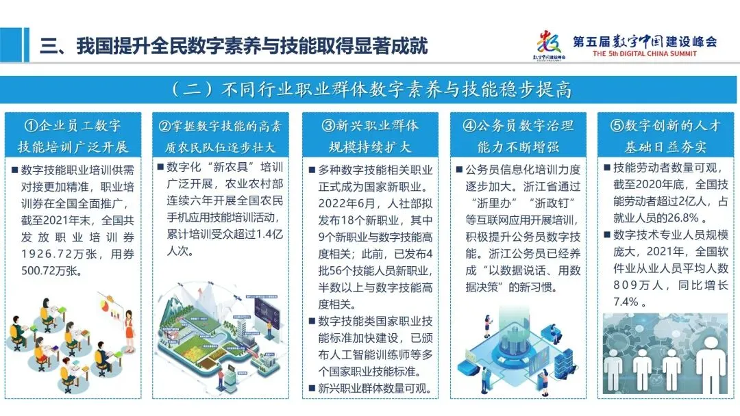 二是企业员工、农民、新兴职业群体、公务员等不同职业群体数字素养与技能稳步提高。以新职业为例,2022年6月,人社部拟发布18个新职业,其中9个新职业与数字技能高度相关。此前,已发布的4批56个技能人员新职业,半数以上与数字技能紧密相关。