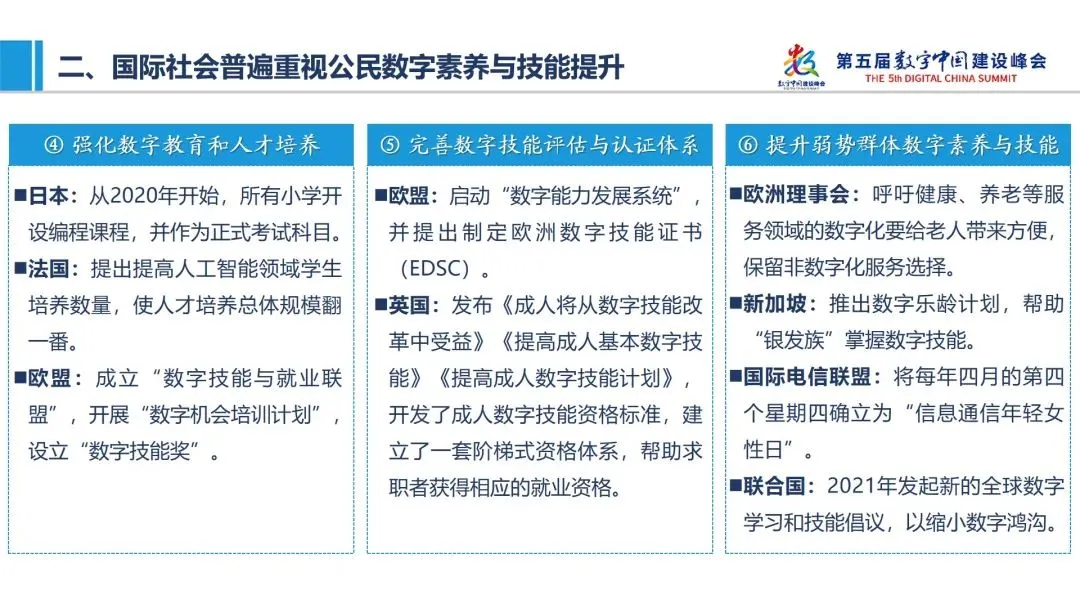 国际社会普遍重视公民数字素养与技能提升,主要采取加强统筹谋划和政策布局,加大专项资金投入力度,建立数字素养与技能框架,强化数字教育和人才培养,完善数字技能评估与认证体系,提升老年人、女性、儿童等弱势群体的数字素养与技能等六大共性举措。