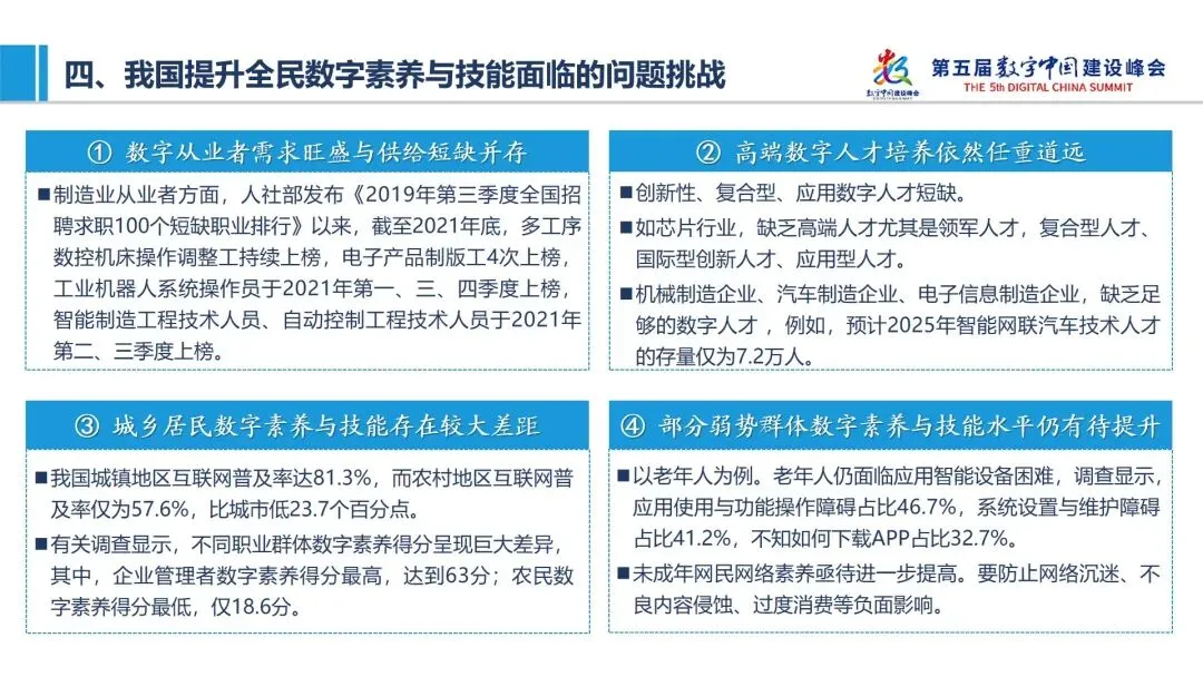 与此同时,我国提升全民数字素养与技能也面临数字从业者需求旺盛与供给短缺并存,高端数字人才培养依然任重道远,城乡居民数字素养与技能存在较大差距,部分弱势群体数字素养与技能水平仍有待提升等问题挑战。
