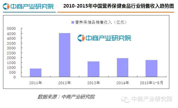 近年来,我国营养保健食品行业销售收入呈现增长趋势,2014年,营养保健食品行业销售收入达1932.20亿元,同比增长22.34%。