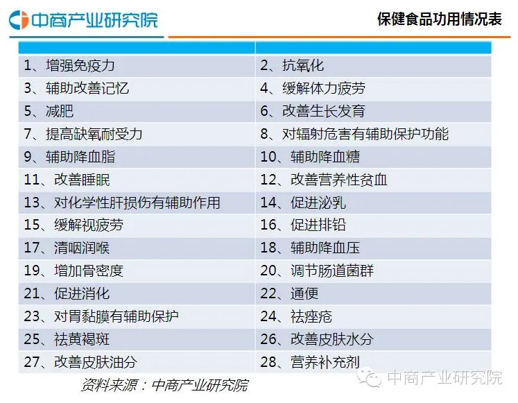 当前国家食品药品监督局批准可受理的保健食品功能可分为28种:增强免疫力、抗氧化、辅助改善记忆、缓解体力疲劳、减肥、改善生长发育、提高缺氧耐受力、对辐射危害有辅助保护功能、辅助降血脂、辅助降血糖、改善睡眠、改善营养性贫血、对化学性肝损伤有辅助作用、促进泌乳、缓解视疲劳、促进排铅、清咽润喉、辅助降血压、增加骨密度、调节肠道菌群、促进消化、通便、对胃黏膜有辅助保护、祛痤疮、祛黄褐斑、改善皮肤水分、改善皮肤油分、营养补充剂。