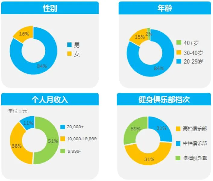 本次调研访问的健身教练以男性居多,占到84%。其中大部分在20-29岁之间,大约一半人的个人月收入在1万元以下。