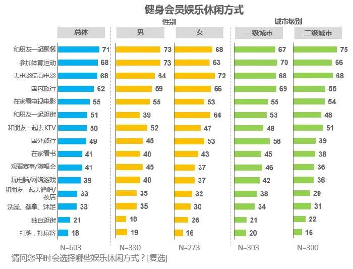 跟朋友聚餐是参与比例最高的活动。除此之外,去电影院看电影和国内旅游也是健身会员的主要娱乐休闲方式。