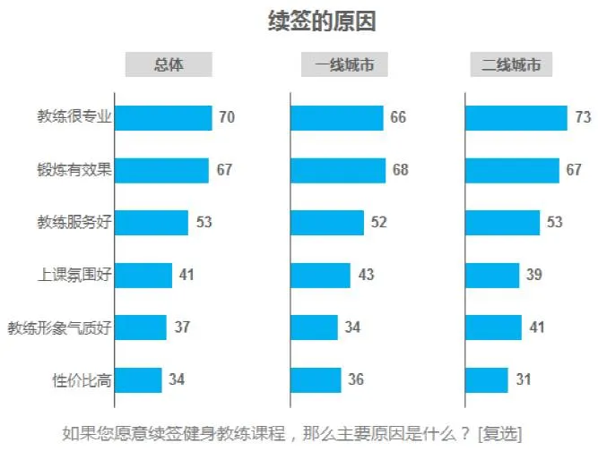 教练的专业性和锻炼的成果是会员的续签的最重要因素,一线城市会员更看重锻炼效果,而二线城市健身会员更看重教练的专业性。
