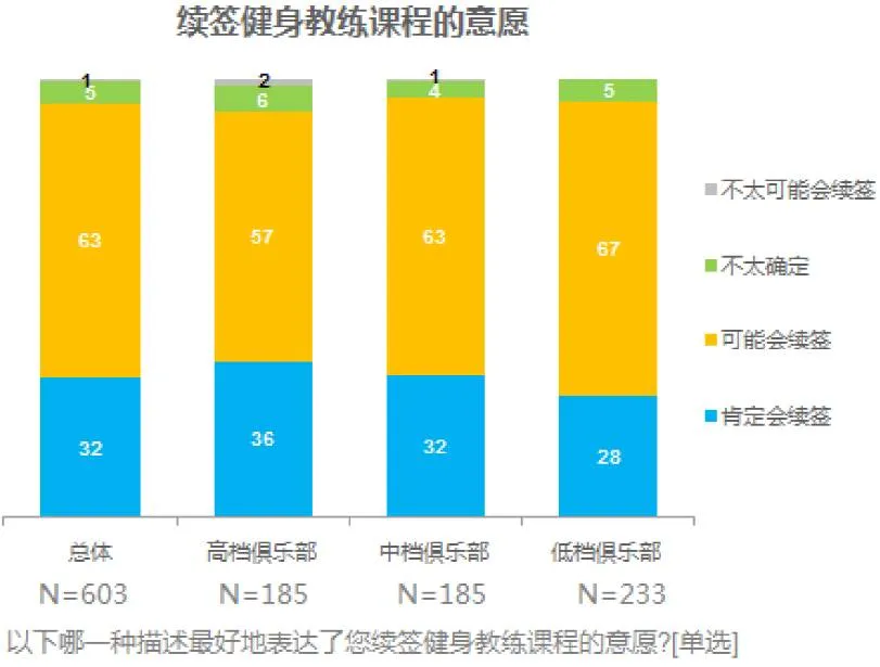超过九成的健身会员表示肯定或可能会考虑续签目前的教练。其中,高档健身俱乐部的会员在“肯定会续签”的比例(36%)上要高于中档(32%)和低档俱乐部(28%),能看出在越高档的健身俱乐部里,会员对于教练忠诚度也相对越高。