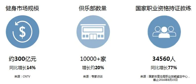 伴随着体育产业规模逐步扩张,中国健身产业也迅速发展,俱乐部、教练数量不断增加。根据中国网络电视台的数据,目前健身市场规模已达到300亿元,同比增长14%;健身俱乐部的数量也不断增加,据专家预估数据,全国范围内约有10000多家有一定规模的健身俱乐部,同比增长了20%以上;持有国家职业资格证书的健身教练数量达到34560名,相比去年同期增长了77%。