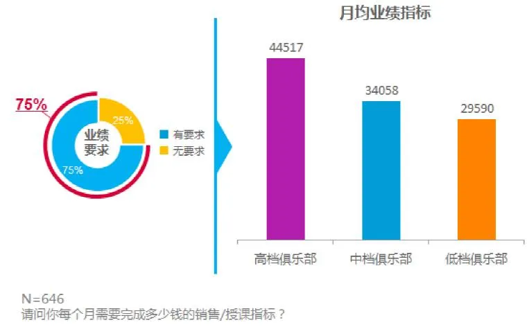 在这一次调查的健身教练当中,有75%的健身教练需要背负着业绩压力,平均的业绩指标为35401元。其中,在高档俱乐部任教的教练平均每月业绩指标为44517元,而在低档俱乐部任职的教练月均指标不到3万元。