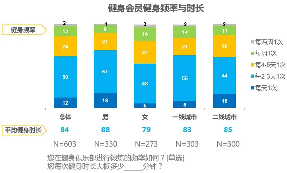 平均健身时长为84分钟,同样也是男性会员的健身时长略长(88分钟))o跟去年的调研结果相比,今年的健身会员锻炼频率和时长都有小幅度的增长。