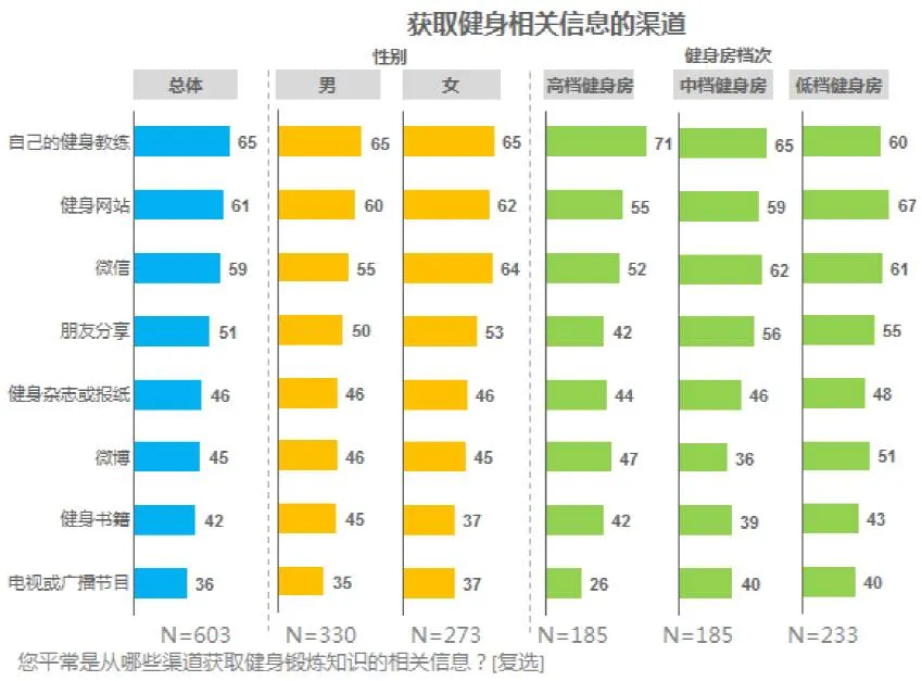 他们在获取健身方面的信息渠道,主要来源是健身教练(尤其对于那些在高档健身房健身的会员),其次是健身网站和微信。与去年相比,微信在传播健身知识的影响力方面有明显上升。