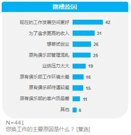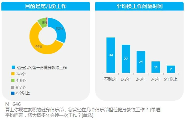 有大约7成的健身教练曾经换过工作,其中接近6成人表示这是第二或第三份教练工作。对于换过工作的教练来说,有1/3的人在不到一年的时间里就更换了他们任教的健身俱乐部,他们大多是为了更好的发展空间和薪金而选择跳槽,也有1/4的人是为了创业而换工作,而由于业绩压力太大而换工作的比例大概为1/5。